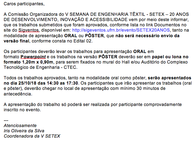 Submissão final de trabalhos CANCELADA 19/10/2018 SUBMISSÕES DAS VERSÕES FINAIS DE TRABALHOS APROVADOS FOI CANCELADA.