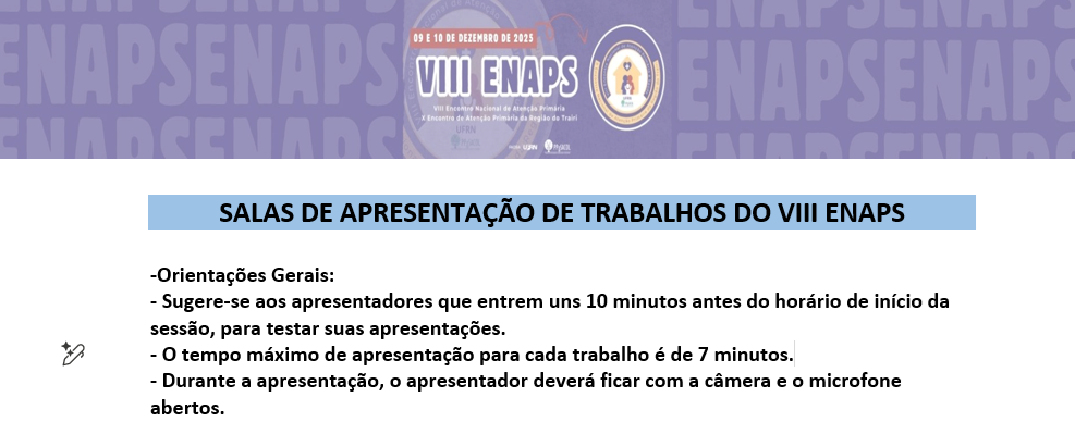 Recomenda-se que os(as) apresentadores(as) acessem a sala virtual com, pelo menos, 10 minutos de antecedência, a fim de testar áudio, vídeo e o arquivo da apresentação.