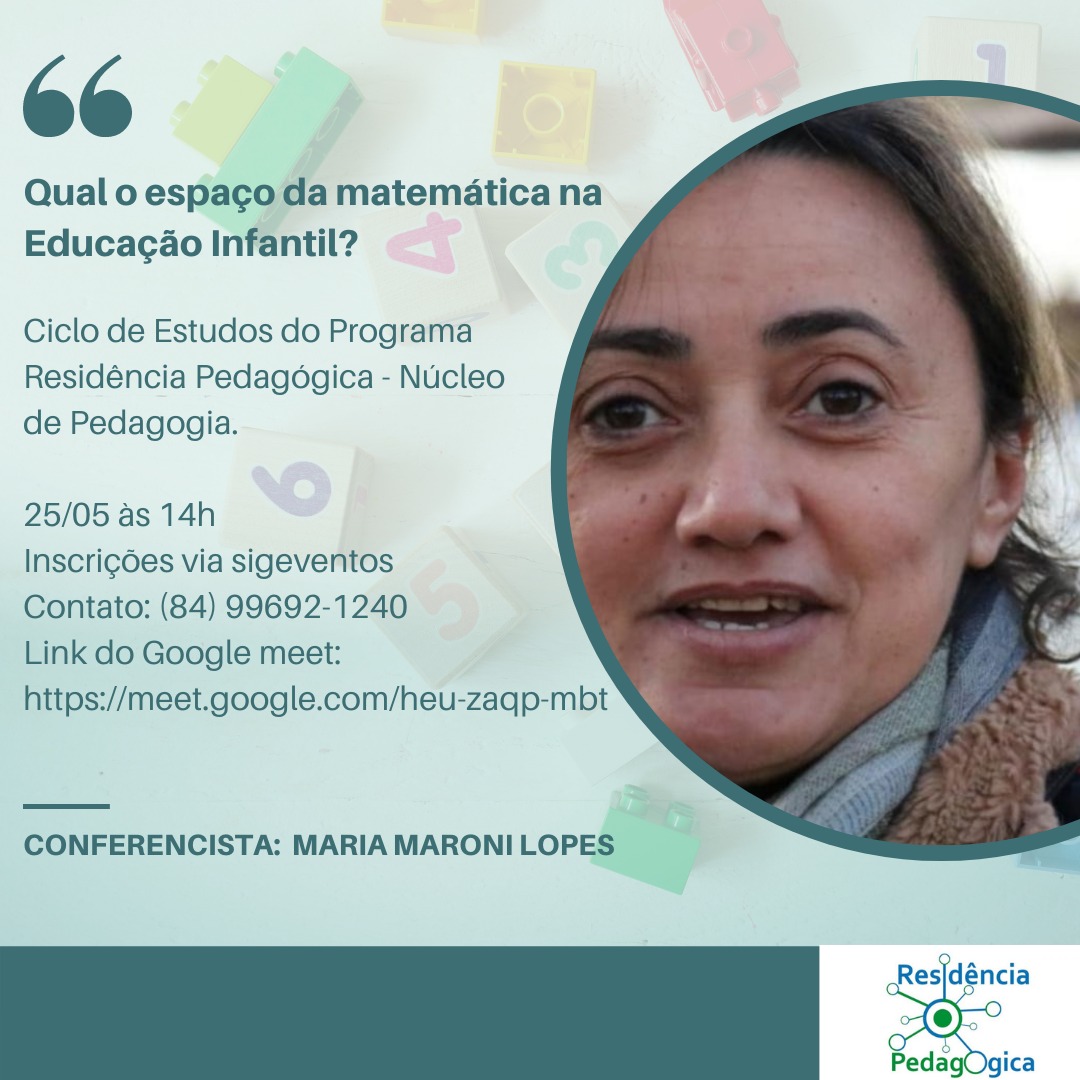 No dia 25 de maio, a partir das 14:00h, o Núcleo de Pedagogia do Residencia Pedagógica do Campus de Caico, estará provendo a conferencia QUAL O ESPAÇO DA MATEMATICA NA EDUCAÇÃO INFANTIL?. A conferencia será realizada pela Profª Drª Maroni Lopes do Departamento de Matemátia do CERES. Esta é uma inciativa que integra o Projeto do Ciclo de Estudos Temáticos cujo objetivo é contribuir com a formaçao de novos professores.